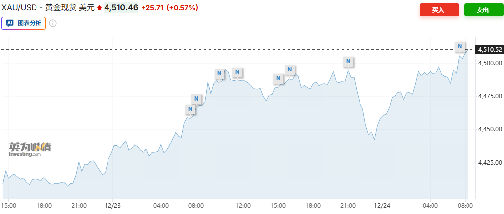 受委内瑞拉紧张局势升级以及市场预期美联储明年将进一步降息的影响,黄金价格再度创下历史新高,首次突破每盎司 4500 美元大关。周三,截至发稿,现货黄金上涨0.57%,至每盎司4,510.46美元,延续了此前连续三天的涨势,今年第五十一个交易日创下新高。白银一度上涨0.6%,创下每盎司71.856美元的历史新高。根据自1987年以来汇编的数据,铂金价格首次突破每盎司2,300美元。钯金价格也出现上涨。